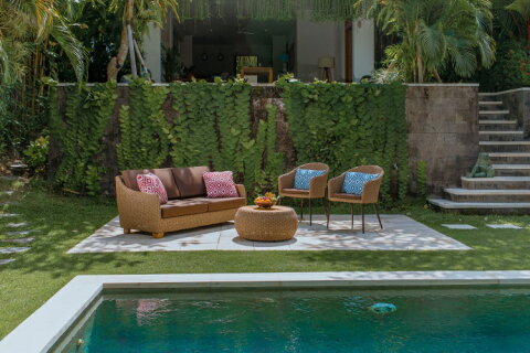 天然のウォーターヒヤシンスのような編み目は、耐久性が高くお手入れも簡単なサスティナブル素材で再現。