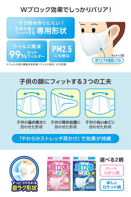 名称 超立体マスクこども用(園児・低学年用) 内容量 5枚×10袋 生産国 日本 材質構成 フィルタ部:ポリオレフィン耳かけ部:ポリオレフィン・ポリウレタン 使用方法 1.部の絵柄を見て、マスクの上下を確認します。