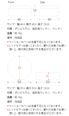 サイズ:幅46×奥行き40×高さ15cm(長方形タイプ) 幅50×奥行き50×高さ15cm(円形タイプ) 製品重量:1kg 材質:ポリエステル、低反発ウレタン、ウレタン 備考:完成品 ※クッションカバーは洗濯不可となっております。