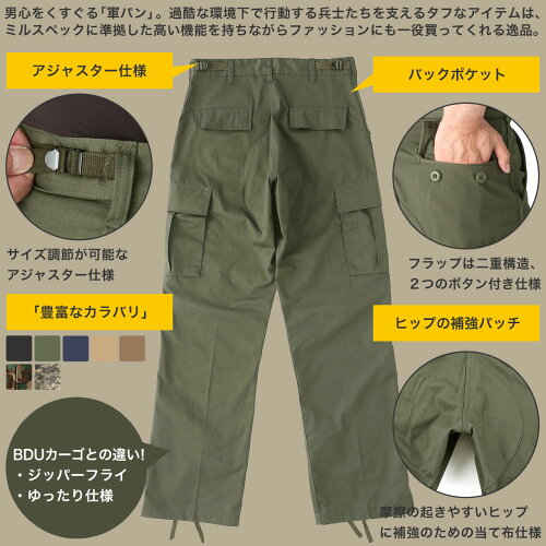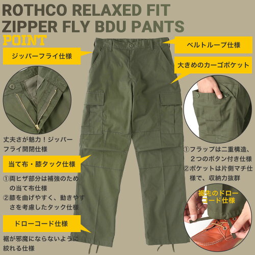 ロスコ カーゴパンツ メンズ BDU ジッパーフライ XS-2XL ROTHCO 【N】20170824【C】20180801【C】20190411【R】20210507 プレゼント用のギフトラッピングはコチラから ▲ラッピング レギュラー ▲ビッグサイズ ブランド説明 ROTHCO ロスコ 60年以上の歴史を持つアメリカを代表するミリタリーウェアブランド COMBAT TESTED SINCE 1953 ROTHCO1953年にアメリカ東海岸のマンハッタンでMilton Somberg (ミルトン・ソンバーグ)によって設立されたROTHCOは、 創立した当初よりアメリカの陸海軍に ミリタリー製品を供給してきた伝統あるミリタリーウエアブランド。