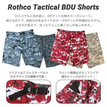 ブランド名:ロスコ|ROTHCOシリーズ名:Rothco Tactical BDU Shortsサイズ:【USA規格】XS・S・M・L・XL・2XLカラー:ミッドナイトDIGITAL(68213)・シティDIGITAL(67213)・デザートDIGITAL(65416)・アーミーDIGITAL(65312)・レッドDIGITAL(67413)・スカイブルーDIGITAL(67313)素材:コットン55% ポリエステル45%|ツイル生地厚み:やや薄手仕様:ボタンフライ仕様|ウエストにアジャスターベルト付き伸縮性:なし透け感:なし生産国:中国製…他ABOUT THE BRANDブランド説明 「ROTHCO|ロスコ」|60年以上の歴史を持つアメリカを代表するミリタリーウェアブランドCOMBAT TESTED SINCE 1953 ROTHCO1953年にアメリカ東海岸のマンハッタンでMilton Somberg (ミルトン・ソンバーグ)によって設立されたROTHCOは、 創立した当初よりアメリカの陸海軍に ミリタリー製品を供給してきた伝統あるミリタリーウエアブランド。